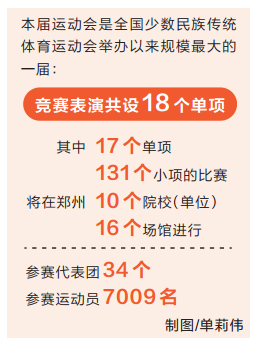據(jù)競賽表演部相關(guān)負(fù)責(zé)人介紹,本屆民族運(yùn)動會競賽表演共設(shè)18個單項,馬上項目比賽已于7月12日至17日在呼和浩特圓滿結(jié)束,其他17個單項,131個小項的比賽將在鄭州10個院校(單位)、16個場館進(jìn)行;參賽代表團(tuán)34個,參賽運(yùn)動員7009名,是全國少數(shù)民族傳統(tǒng)體育運(yùn)動會舉辦以來規(guī)模最大的一屆。另外,本屆運(yùn)動會還將突出河南省武術(shù)大省的優(yōu)勢,“少林拳”和“陳氏太極拳”等也將一一呈現(xiàn)。