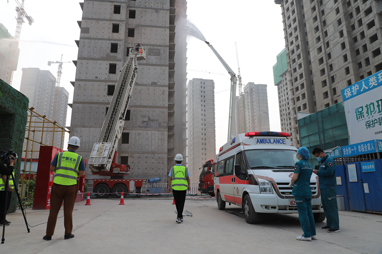 啟動儀式上,在工地現(xiàn)場開展了消防救援應急演練。該環(huán)節(jié)模擬施工現(xiàn)場發(fā)生火災時,現(xiàn)場管理人員應急操作反應及配合市消防救援支隊展開滅火救援的案例。演練現(xiàn)場火災模擬真實生動,4部消防車、1部救援車、1部救護車實地奔赴現(xiàn)場開展滅火及救援。整個演練過程現(xiàn)場組織嚴密、人員到位快速、操作程序得當,達到了預期效果。宣誓環(huán)節(jié),由中建二局三公司代表引領各參賽單位代表共同開展安全宣誓。趙新中為各參賽單位授旗。