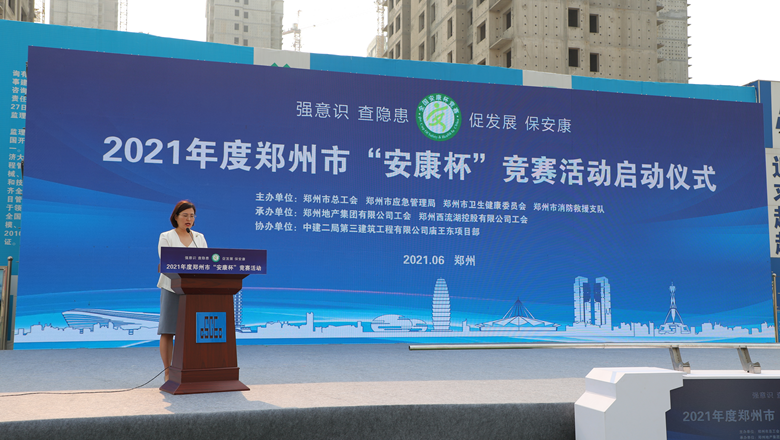 為深入貫徹落實習近平總書記有關加強安全生產工作的部署和要求,進一步強化各級各部門、各企業(yè)主體的安全責任意識,確保我市安全生產形勢持續(xù)好轉,職工安全健康不斷鞏固。6月11日上午,由鄭州市總工會、鄭州市應急管理局、鄭州市衛(wèi)生健康委員會及鄭州市消防救援支隊主辦,鄭州地產集團工會、鄭州西流湖控股有限公司工會承辦的鄭州市2021年“安康杯”競賽啟動儀式在中原新區(qū)廟王東安置區(qū)項目成功舉行。鄭州市相關組織部門、市總工會成員單位、地產集團、西流湖公司、各參建單位共200余人參加啟動儀式。鄭州市一級巡視員,市總工會黨組書記、主席趙新中、鄭州市衛(wèi)生健康委員會黨組成員、二級調研員楊德林、鄭州市應急管理局三級調研員安春茂、鄭州市消防救援支隊副支隊長、滅火救援指揮部部長李隆、鄭州市總工會副主席宋少丹、鄭州地產集團有限公司監(jiān)事會主席、工會主席李靜波、鄭州地產集團西流湖公司黨支部書記、董事長、總經理 吉獻亮,中建二局第三建筑工程有限公司西北分公司黨委副書記、執(zhí)行總經理趙海軍出席儀式。啟動儀式由市總工會勞動和經濟部部長宋慧主持。